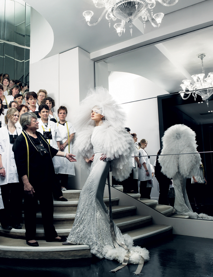 Natalia Vodianova with Chanel’s head dressmaker Martine Houdet and Chanel colleagues, photographed by Patrick Demarchelier for Vogue, 2008.
