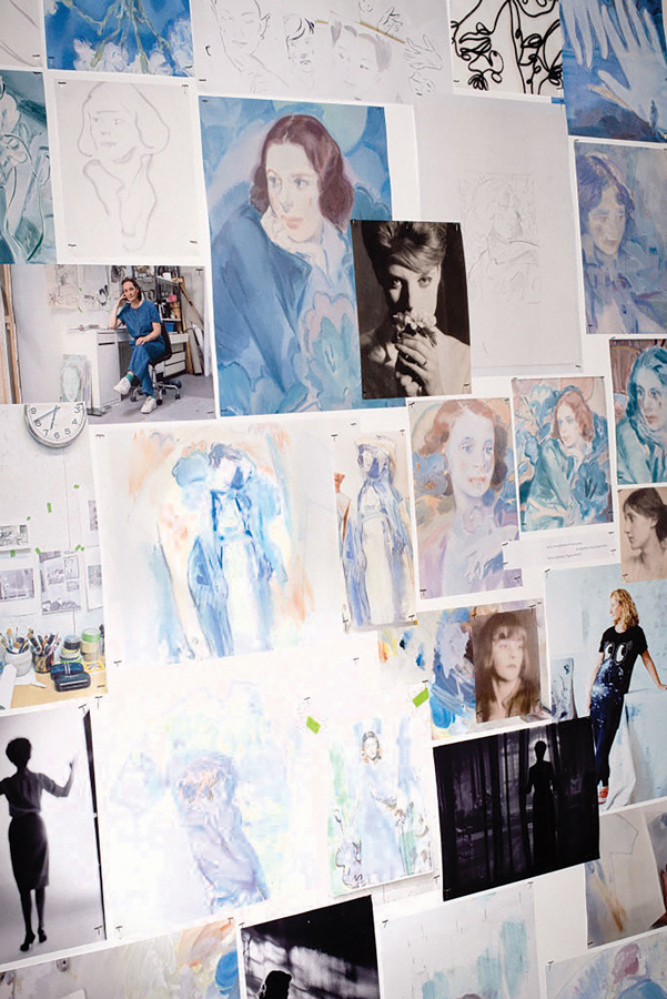 Kaye’s approach resonated with Erdem’s own process. “I always had it in the back of my mind that Kaye would be an amazing person to collaborate with. I too tend to work through narratives and stories, usually centered around people from the past, figures I can abstract in some way. For example, I once did a collection based on Ernest Boulton and Frederick Park, two men who lived as sisters Stella and Fanny, and who were arrested. Or Marian North, an English Victorian biologist, and Radclyffe Hall, the English poet and author, best known for her novel The Well of Loneliness, a groundbreaking work in lesbian literature,” he explains. “Kaye was so generous with her art. We took a pattern piece and Kaye filled it in with a portrait; just to see what happened, taking something that she would normally apply to canvas and adapting it. We took banal wallpaperlike prints and Kaye painted over them and applied them to very structured garments, and the result was so interesting.”