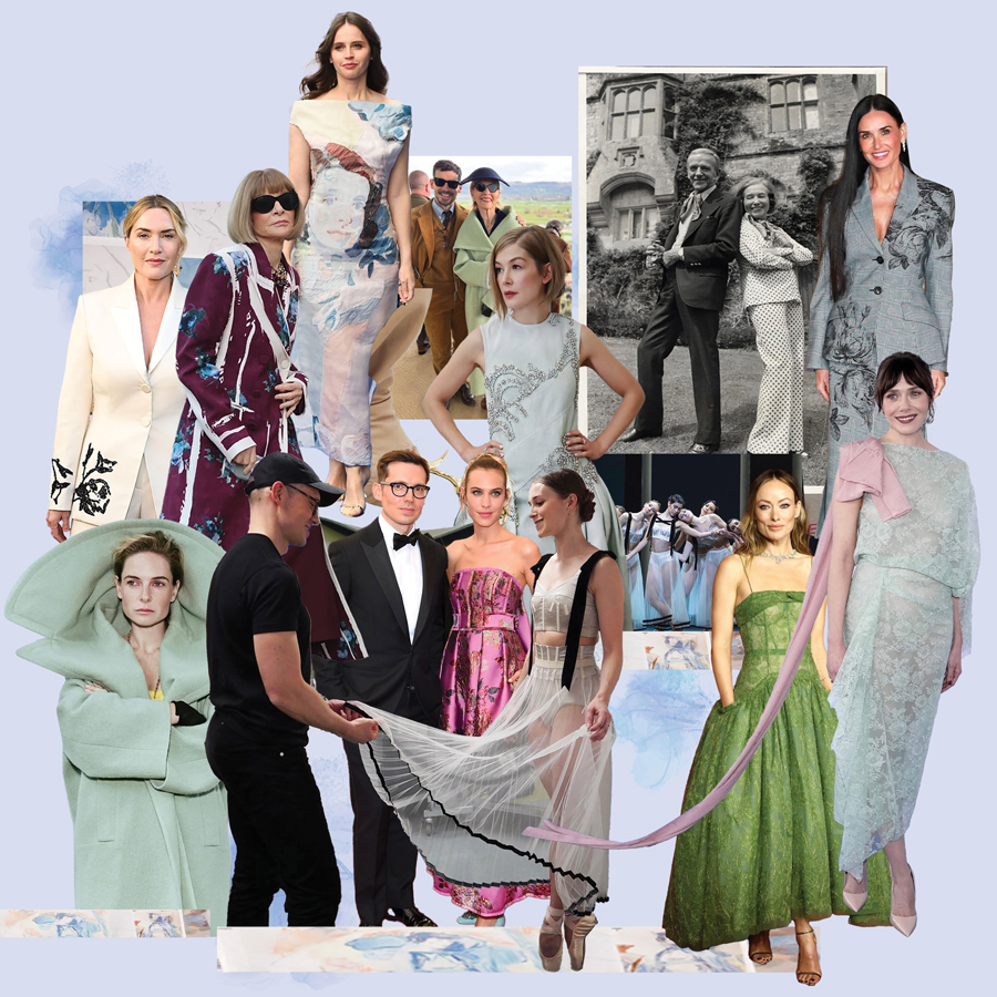 Standout AW25 pieces include dreamy organza cocktail dresses printed with Kaye’s portraits, a glistening green sequined slash-neck pencil dress, couture-like crushed satin skirts, sheath dresses printed with Kaye’s abstract floral artwork, and handpainted portraits on “limited, limited edition” Bloom handbags that Erdem finished with an Art Nouveau inspired brass flower handle. “As a designer, you strive for something very permanent and beautifully designed,” he says.