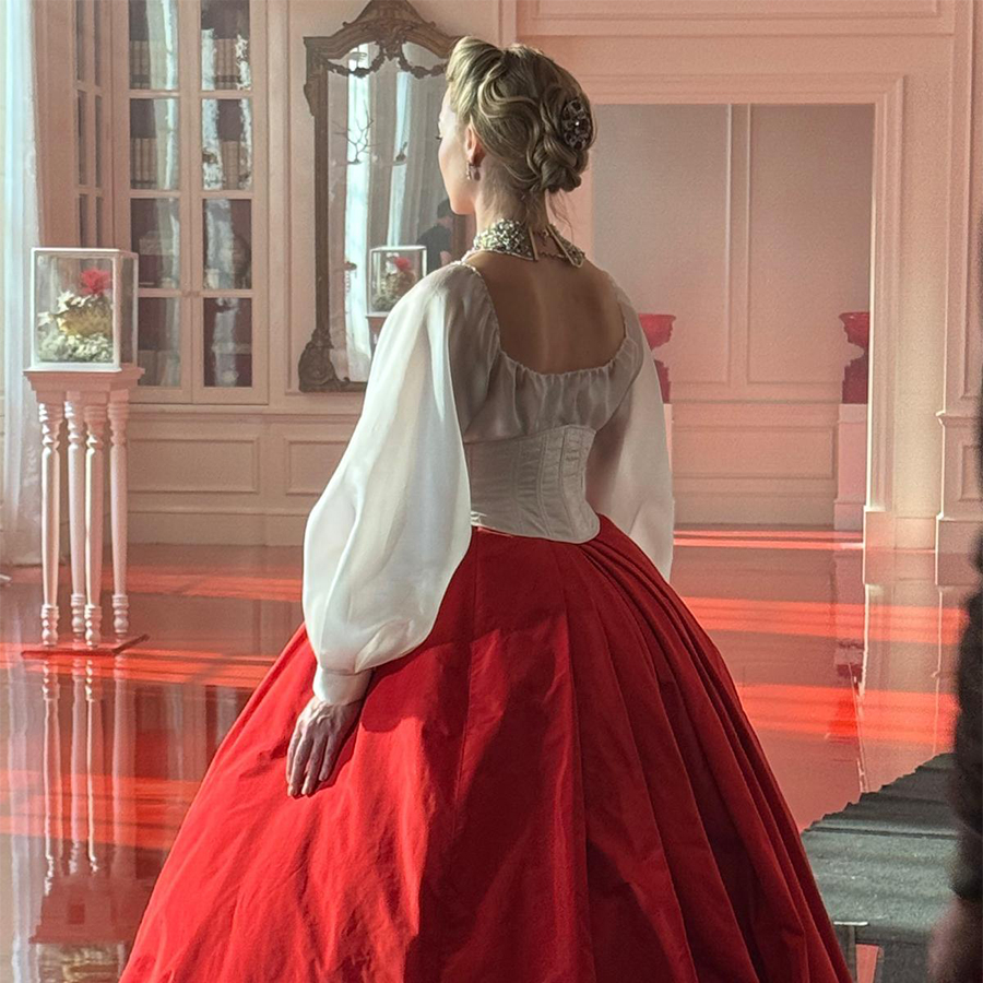 Everyone had said, imagine this as if it is through the imagination of a 14-year-old girl. Almost fairytale-like: it’s kind of a sort of mash-up of melodrama meets a pinch of some kind of historical reference, but not necessarily pinned to a date. It was really just being able to choose from this smorgasbord of resources that we have out here in the world, and to introduce elements that we liked, and to put them in our world. I don’t think I’ve ever worked on anything that offered quite so much freedom to introduce just whatever – it was all about what suited and what worked, rather than going to a defined period in time, there was certainly none of that. I mean, there were certain eras, like Old Hollywood, that we dipped into, but it was a real mishmash.