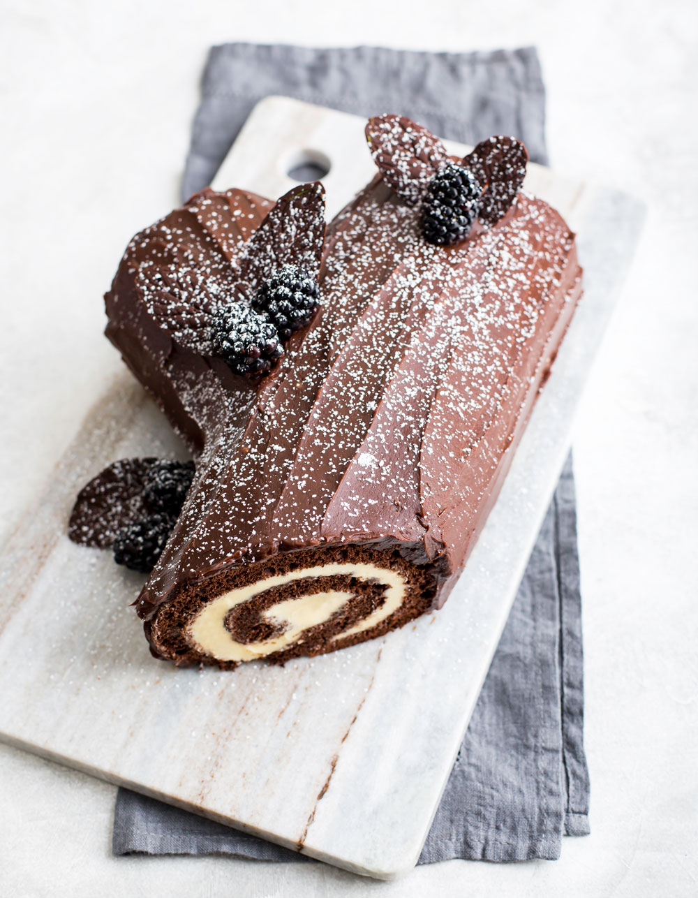 It’s fantastic to have one good Christmas dessert recipe up your sleeve, so you can enjoy the tradition of making it every year, and also the voilá! moment when you present it to your expectant guests. This recipe, which is only a tiny bit trickier than a trifle, is a brilliant one for a Christmas gathering. It looks so splendid and festive and tastes absolutely delicious, the peppermint chocolate giving it a moreish minty flavour. You could also try an orange yule log, or a plain milk chocolate one – just choose your chocolate according to your taste. Because there is sponge-rolling and decorating involved, it’s nice to get someone else, or the kids, to join in. Hand them a Christmas cocktail (not too strong!) and a sieve, and let them get stuck in! It will keep for 2-3 days at (cool) room temperature in an airtight container. It can also be refrigerated, though it’s best eaten at room temperature.